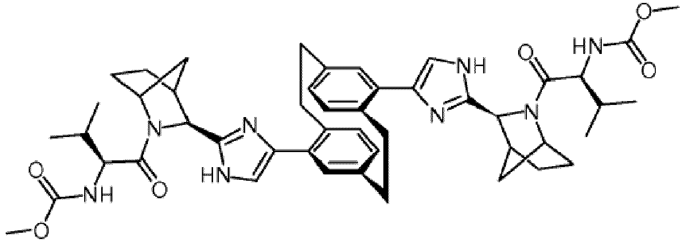 - PSBKWSOFLWPWJS-JAMPNRCKSA-N COC(N[C@@H](CCSC)C(N(CC1C2CCC1)[C@@H]2c1nc(-c(cc2)ccc2-c2cc(CC3)ccc2CCc2cc(-c(cc4)ccc4-c4c[nH]c([C@H](C(CCC5)C5C5)N5C([C@H](CCSC)NC(OC)=O)=O)n4)c3cc2)c[nH]1)=O)=O Chemical compound COC(N[C@@H](CCSC)C(N(CC1C2CCC1)[C@@H]2c1nc(-c(cc2)ccc2-c2cc(CC3)ccc2CCc2cc(-c(cc4)ccc4-c4c[nH]c([C@H](C(CCC5)C5C5)N5C([C@H](CCSC)NC(OC)=O)=O)n4)c3cc2)c[nH]1)=O)=O PSBKWSOFLWPWJS-JAMPNRCKSA-N 0.000 description 1
