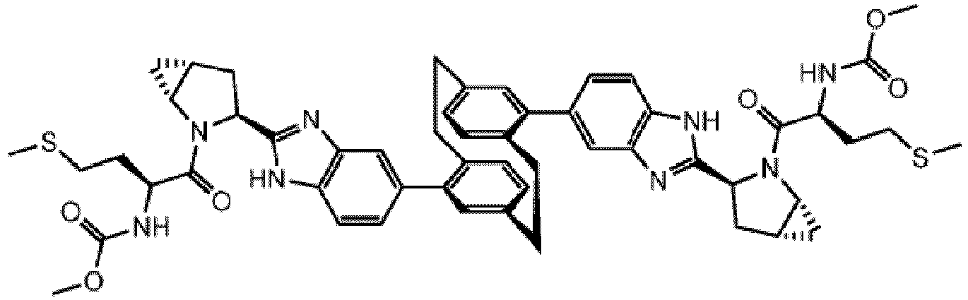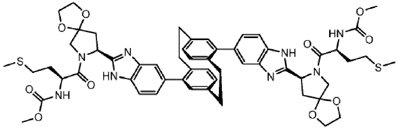 - GBRJFMGRDDWHOV-HXTLAZEUSA-N COC(N[C@@H](CCSC)C(N(CCCC1)[C@@H]1c1nc(-c(cc2)ccc2C2=CC(CC3)=CC[C@@]2(C2)[C@@H]2C[C@@H](C2)C=CC3=C2c(cc2)ccc2-c2c[nH]c([C@H](CCCC3)N3C(/C(/NC(OC)=O)=C/CSC)=O)n2)c[nH]1)=O)=O Chemical compound COC(N[C@@H](CCSC)C(N(CCCC1)[C@@H]1c1nc(-c(cc2)ccc2C2=CC(CC3)=CC[C@@]2(C2)[C@@H]2C[C@@H](C2)C=CC3=C2c(cc2)ccc2-c2c[nH]c([C@H](CCCC3)N3C(/C(/NC(OC)=O)=C/CSC)=O)n2)c[nH]1)=O)=O GBRJFMGRDDWHOV-HXTLAZEUSA-N 0.000 description 1