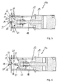 - a compressed air supply opening for the compressed air supply of the front inlet openings and / or compressed air nozzles of the mixing container in a region between an end face of the empty drive for the adjustment of the closure pins, in particular between an end face of the Pneumatic piston and the air outlet openings of the front-side air pressure nozzles is arranged opening a space between the end face and the air outlet openings, at least during the cleaning process but optionally also with closed outlet openings are under pressure, so that contamination by the entry of mix in the individual air outlet openings of the front side inlet openings Mixing container can be avoided.