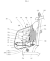 - arrangement of component parts follows such a shape that a central portion of a front end part (front part) of a vehicle body with respect to a width direction of the vehicle protrudes frontward while side portions located at the right and left sides of the central portion extend obliquely rearward.