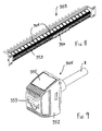- a patch panel arrangement 1 of the prior art is illustrated which takes the form of a rack 2 on which are mounted eight patch panels 3 (indicated in sequence 3A, 3B, 3C, 7-8 etc.). One of the patch panels 3C is shown removed from the rack. Each of the patch panels has a plurality of apertures 4 punched therein and each aperture 4 is arranged to take a cable terminating device 5 to which the individual wires 7 of a cable 8 are terminated.