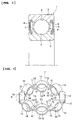 - Each of the cage elements 10 is made of a metal plate material such as steel plate, stainless steel plate and the like, and obtained by bending the material in the circumferential direction while at the same time punching out the material into a ring shape by a pressing process so that there are flat sections 12 and semi-circular shaped sections 13 that are alternatively arranged in the circumferential direction.