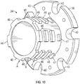 - the structure of the exemplary top drive cement swivel 16 is better understood with reference to Figures 5-10 . It can be seen that the cement swivel 16 has a generally box-shaped main housing 50. A central axial flowbore 52 passes vertically through the main housing 50. Lateral fluid flow openings 54, 56 extend through the main housing 50 and permit fluid communication between the central flowbore 52 and the exterior of the cement swivel 16. A tubular breech lock box connector 58 extends outwardly from the main housing 50. As illustrated in Figures 11 and 12 , the breech lock box connector 58 defines an interior bore 60 having a plurality of inwardly projecting ridges 62.