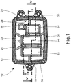 - the trough-shaped housing part 12 with the outwardly facing tabs 18, 20, 22 bounded together with the bottom cover 14 defines an approximately cuboidal interior 54, in which a planar printed circuit board 56 is arranged with an electronic circuit 58.