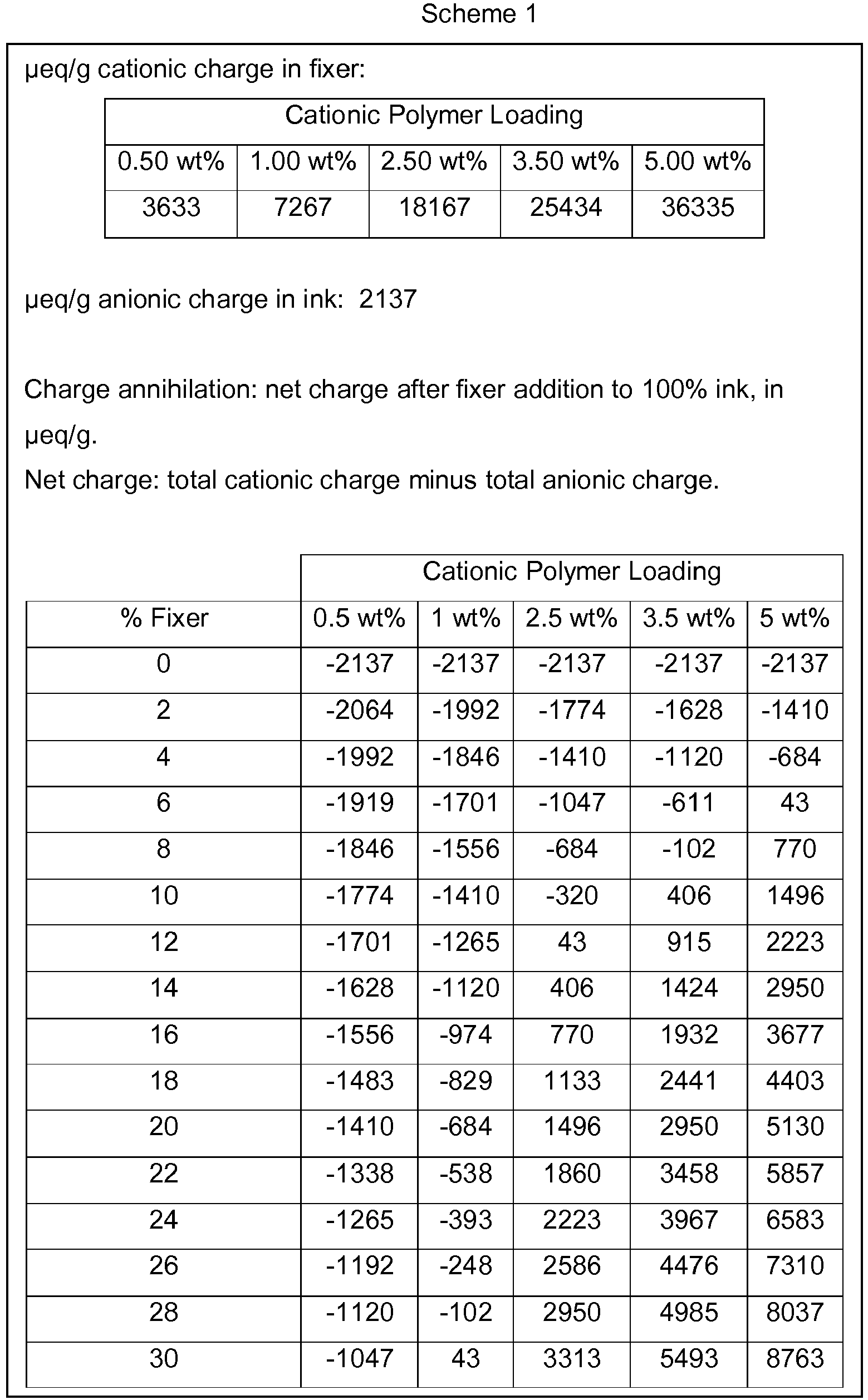 - the volume of fixer fluid applied is determined by the amount of ink used for the specified image. Specific ratios of ink and fixer are dependent on the specific chemistry and concentration of both the cationic polymer in the fixer and the anionic components in the ink.