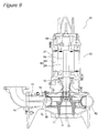 - the pump impeller 111 is adapted to take in sewage from the intake port 129 that is open downward in coaxial with the driving shaft 118, and the sewage is drained from the discharge port 134 through the one spiral flow channel.
