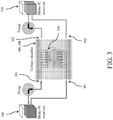 - FIG. 3 demonstrates the fluid-routing manifolds 300, 400 with two inlets 301, 302 and two outlets 401, 402 (wherein the direction of flow is denoted by the arrows) allowing introduction of two different types of fluid 310, 320 ("Media #1" and "Media #2").