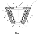 - Within the casing are contained four getter cartridges 22, 23, 24, 25, each with its own positioning plane 222, 232, 242, 252 orthogonal to the revolution axis 26 and intersecting the midpoint of the cartridge linear supports 221, 231, 241, 251.