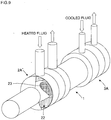 - the low-temperature side heat exchanger 3 receives the inflow of cooled fluid (e.g., water) at relatively low temperatures compared with the heated fluid flowing in the high-temperature side heat exchanger 2 and transmits the cold heat to the upper end of the heat/acoustic wave conversion component 1 of Fig. 1 to let the cooled fluid having a temperature higher than that at the inflow flow out.