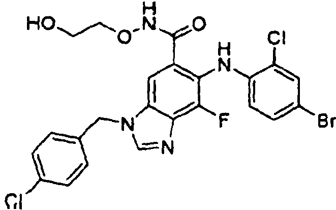 - ACWZRVQXLIRSDF-UHFFFAOYSA-N binimetinib Chemical compound OCCONC(=O)C=1C=C2N(C)C=NC2=C(F)C=1NC1=CC=C(Br)C=C1F ACWZRVQXLIRSDF-UHFFFAOYSA-N 0.000 claims description 4