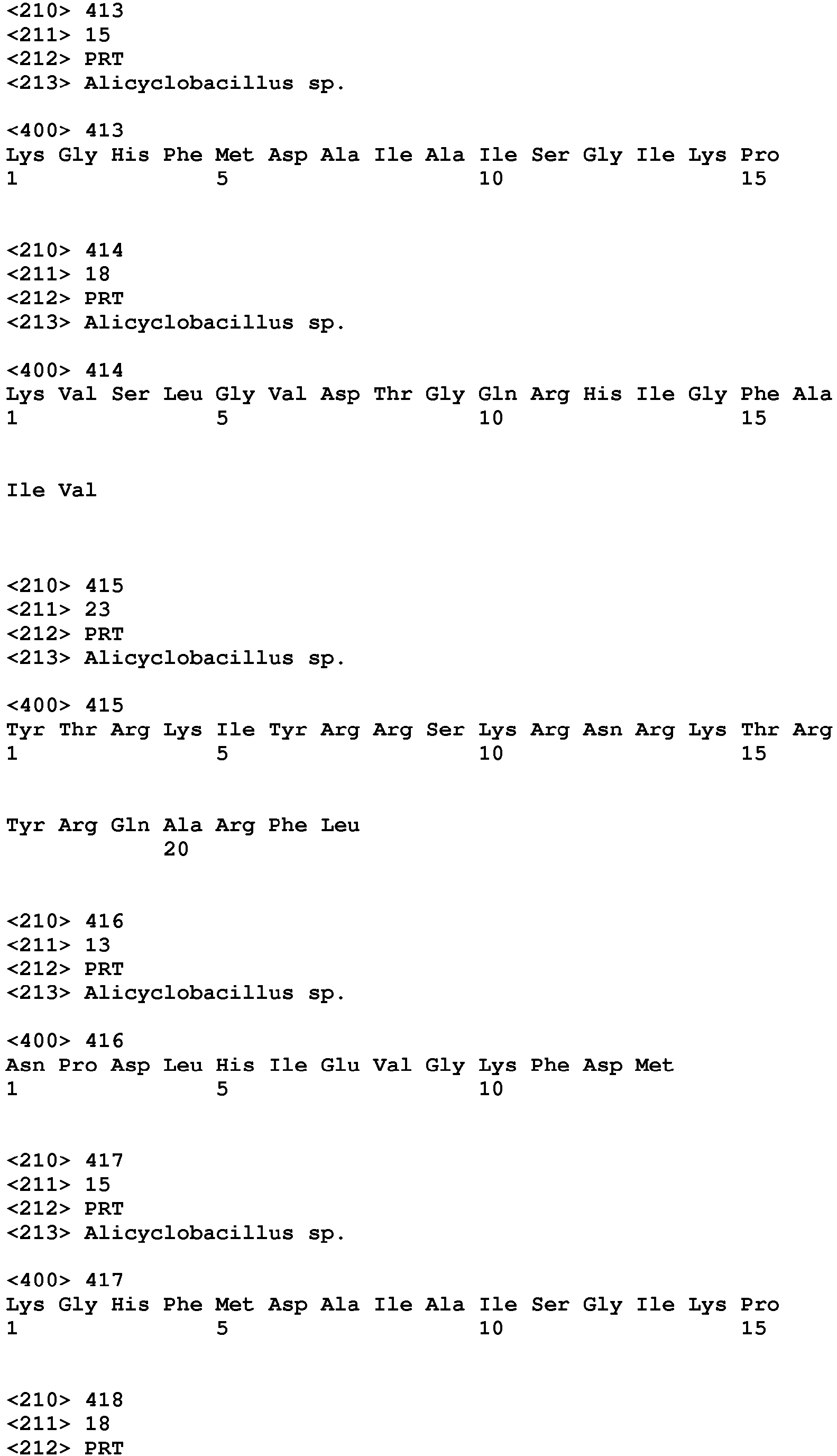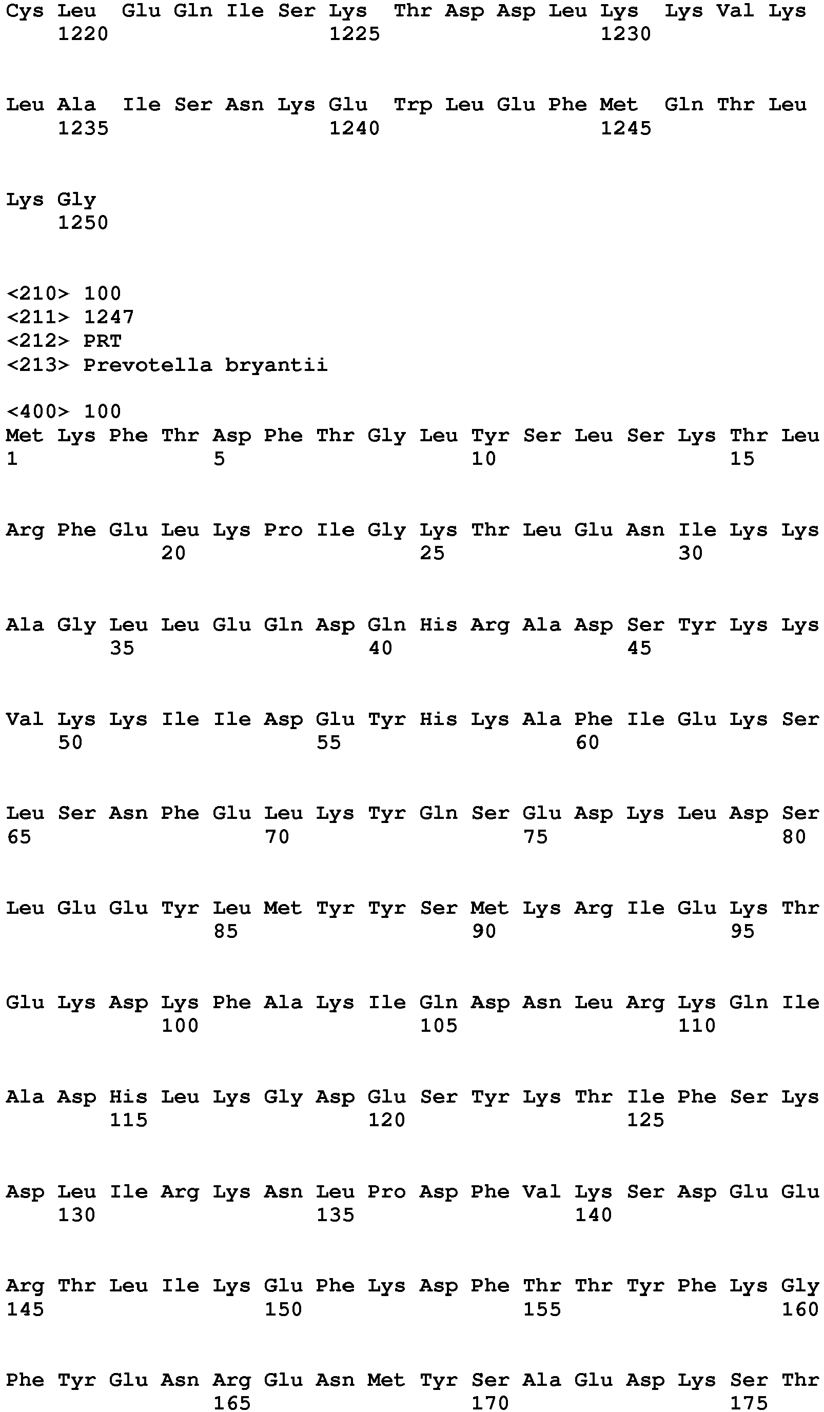 - the invention provides a method of modifying sequences associated with or at a target locus of interest, the method comprising delivering to said locus a non-naturally occurring or engineered composition comprising a putative Type V CRISPR-Cas loci effector protein and one or more nucleic acid components, wherein the effector protein forms a complex with the one or more nucleic acid components and upon binding of the said complex to the locus of interest the effector protein induces the modification of the sequences associated with or at the target locus of interest.