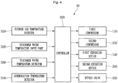 - the first refrigerant cycle includes a first compressor 110 that compresses the first refrigerant, an outdoor heat exchanger 130, and an optional flow switch 120 that guides the refrigerant compressed in the compressor 110 to the outdoor heat exchanger 130 or a water-refrigerant heat exchanger 300.