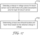 - a change in voltage across the sensor responsive to deformation of a first piezoelectric layer of a touch sensor is detected.
