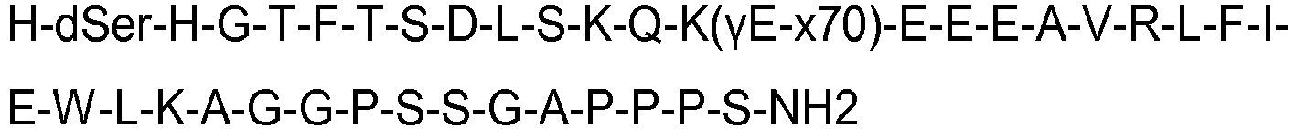 - Liraglutide is shown as SEQ ID NO: 3: HAEGTFTSDVSSYLEGQAAK((S)-4-Carboxy-4-hexadecanoylamino-butyryl-) EFIAWLVRGRG-OH