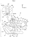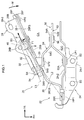 - a front end portion 28F of the side wall portion 28-1 (second arm 28) is coupled to a front end portion 26F of the first arm 26 (front side inclined wall 26FS) so as to be capable of swinging by a second hinge pin HP2, serving as a "second pin” of an example of technology disclosed herein.