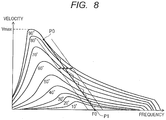 - FIG. 7 illustrates loci of the driving velocity using both of phase difference control and frequency control in velocity characteristics of the vibration motor in the case where a frequency as a starting point (hereinafter also referred to as an activation frequency) is changed.