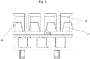 Fig. 6 is a side view of the distribution system (1) suitable to process returns in which one can see that the tray (14) is positioned at 45° to facilitate the fall of the publications into the bins or pallboxes (15). - According to a preferred - but not limiting - embodiment, this invention concerns the use of a system (1) for the distribution of periodicals and newspapers known and implemented through a series of components in order to perform the daily return function in addition to the distribution function. The system (1) for the distribution and the automatic packaging of periodicals and newspapers disclosed in patent application No.