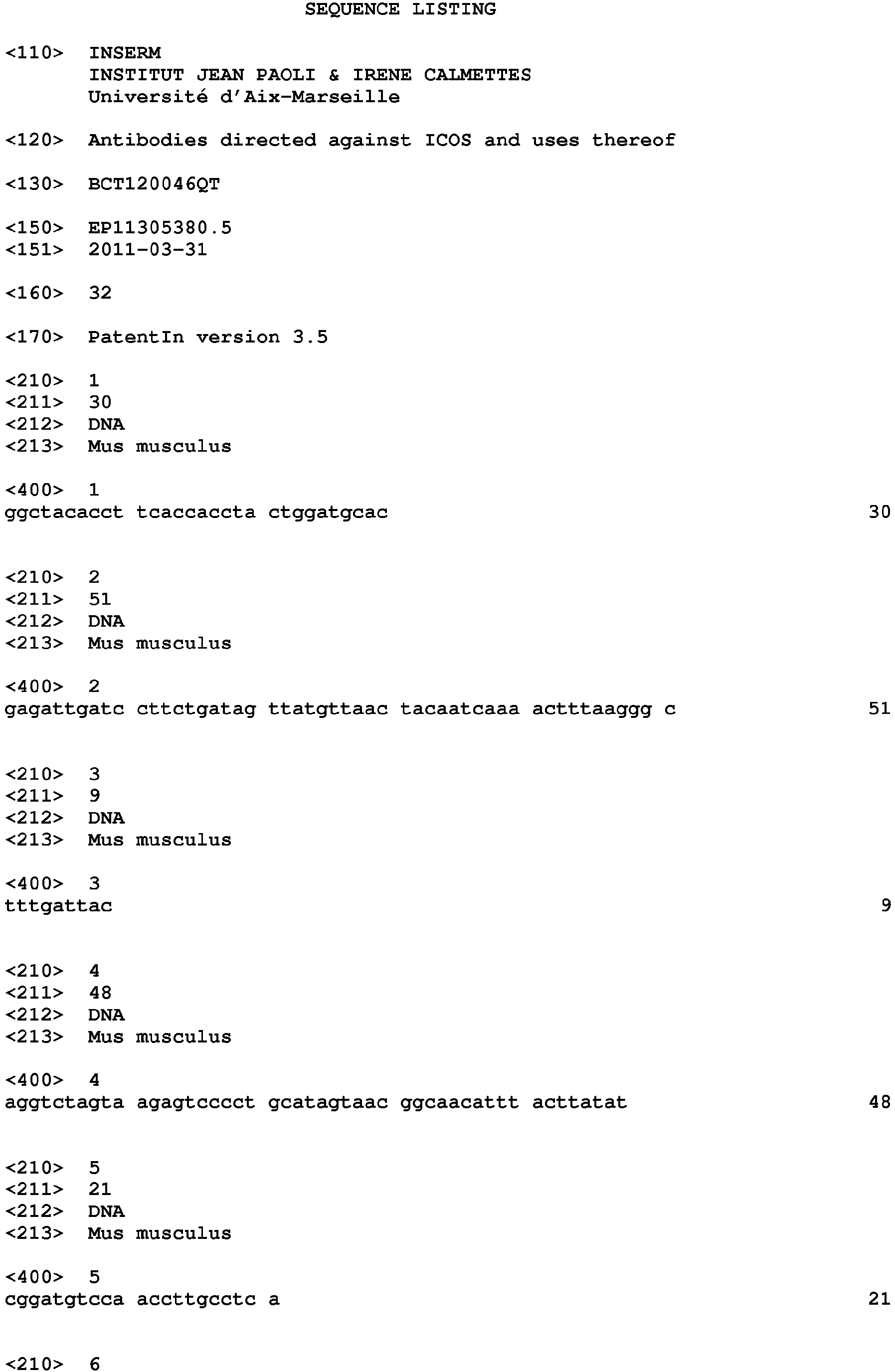 - the invention further relates to an antibody directed against ICOS, wherein said antibody is selected from the group consisting of Icos 145-1 and Icos 314-8, respectively obtainable from the hybridoma deposited at the "Collection Nationale de Cultures de Microorganismes" (CNCM, Institut Pasteur, 25 rue du Dondel Roux, 75724 Paris Cedex 15, France), in accordance with the terms of Budapest Treaty, on July 2, 2009 under the accession numbers CNCM I-4179 and CNCM I-4180 and derivatives thereof.