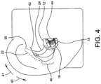 - the body is placed in the ear and pushed gently inward and preferably rotated counter-clockwise as indicated by arrow 43. Pushing the body into the ear causes the body 12 and the outer leg 22 to seat in position underneath the anti-tragus, and causes the outlet section 15 of the body 12 to enter the ear canal. Rotating the body counter-clockwise properly orients in the Z-direction the outer leg 22 for the steps that follow.