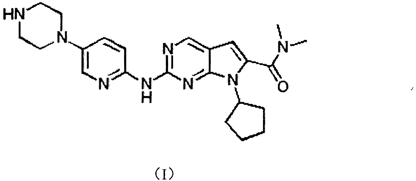 - the chemical name of LEE011 is 7-cyclopentyl-2-(5-piperazin-1-yl-pyridin-2-ylamino)-7H-pyrrolo[2,3-d]pyrimidine-6-carb oxylic acid dimethylamide, and it has the structural of formula I: