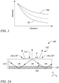 - Figure 1 illustrates a graph of light intensity within a leaky light guide as a function of distance along a propagation axis of the light, according to an example of the principles described herein.