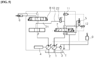 - a boom cylinder 5 driven by hydraulic fluid of the first hydraulic pump 1 is connected to the first hydraulic pump 1.