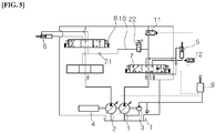 - a boom cylinder 5 driven by hydraulic fluid of the first hydraulic pump 1 is connected to the first hydraulic pump 1.