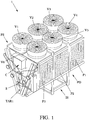 - the top wall of the housing also supports a plurality of fans V1, V2, V3, V4, V5 and V6, designed to generate air, with appropriate flow rate and speed, to be blown simultaneously onto the heat exchange battery C1 and onto the panels of the adiabatic pack P1, P2, P3, onto each of which the above-mentioned respective top nozzles U1, U2, U3 spray an appropriate amount of water at a predetermined flow rate and frequency.