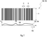 - the barcode may be one of a "linear barcode”, also denominated as a “one-dimensional barcode”, which represents data by varying a width and a spacing of parallel lines, a "two-dimensional barcode” which represents data within an arrangement of bars, rectangles, squares, hexagons, or any other geometric pattern being distributed over a limited two-dimensional area, and a "dot code” which comprises a specific number of dots distributed again over a limited two-dimensional area.