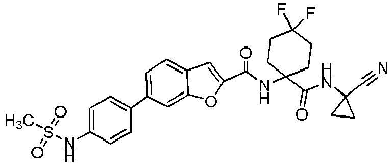 - WQNJBTDDFUYXKH-UHFFFAOYSA-N N#CC1(CC1)NC(C(CC1)(CCC1(F)F)NC(c([o]c1c2)cc1ccc2-c(cc1)ccc1S(N1CCOCC1)(=O)=O)=O)=O Chemical compound N#CC1(CC1)NC(C(CC1)(CCC1(F)F)NC(c([o]c1c2)cc1ccc2-c(cc1)ccc1S(N1CCOCC1)(=O)=O)=O)=O WQNJBTDDFUYXKH-UHFFFAOYSA-N 0.000 description 1