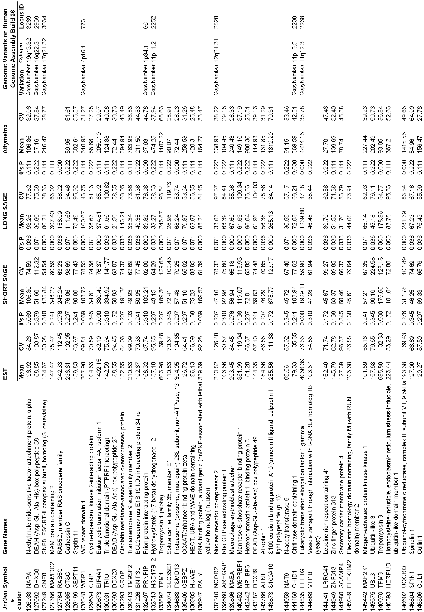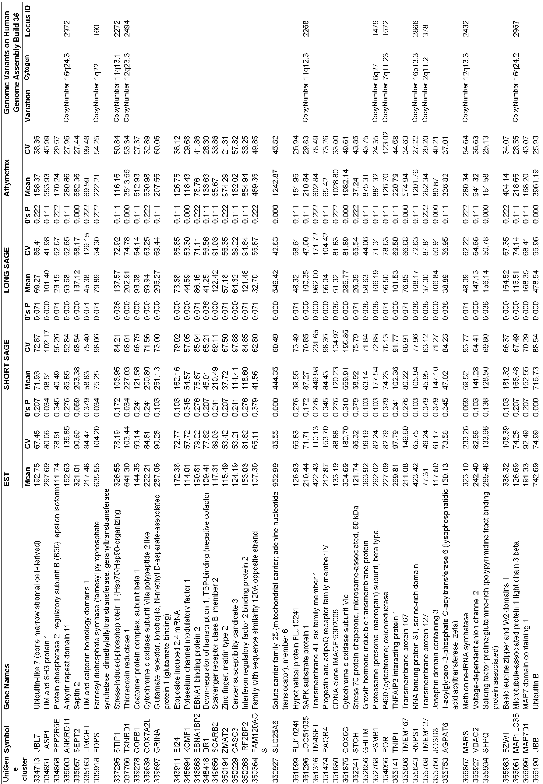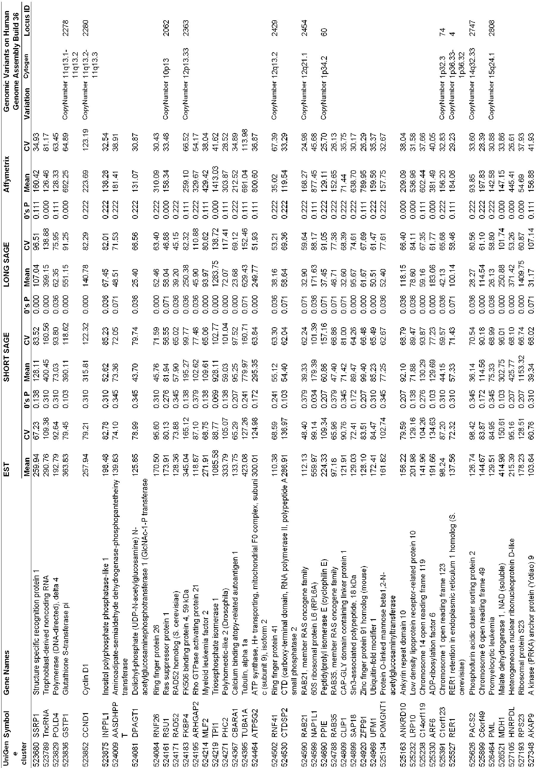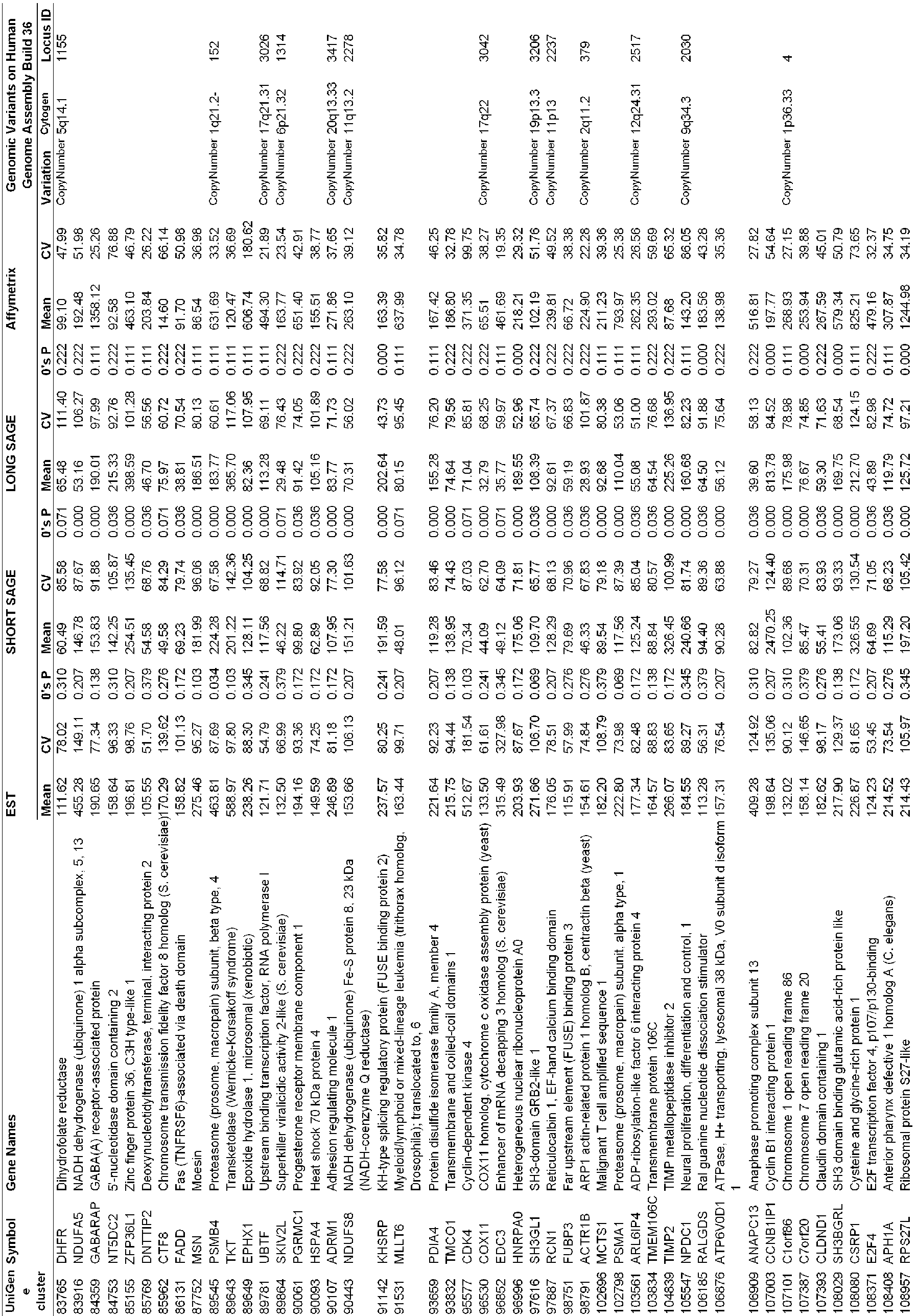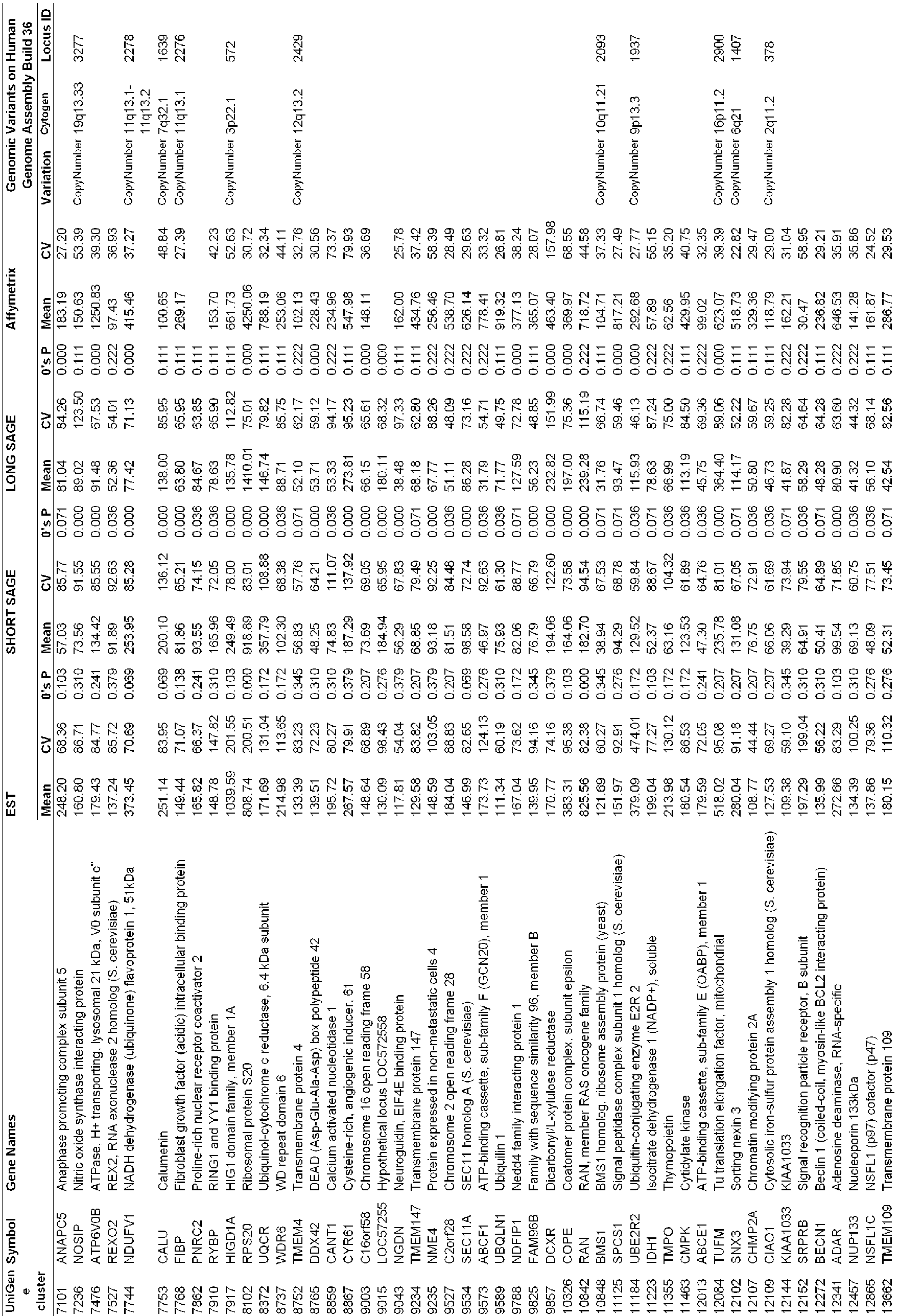 - the mean gene expression values and CV (%) of the 2,087 candidate reference genes were calculated using another dataset, Affymetrix HG-U133, as well as in EST and SAGE datasets.