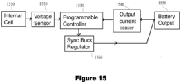 - the regulator(s) being operatively connected to the programmable controller (U1) and is adapted to be activated by the programmable controller (U1) at a preset battery output level in order to regulate the output voltage. This will now be described in more detail.