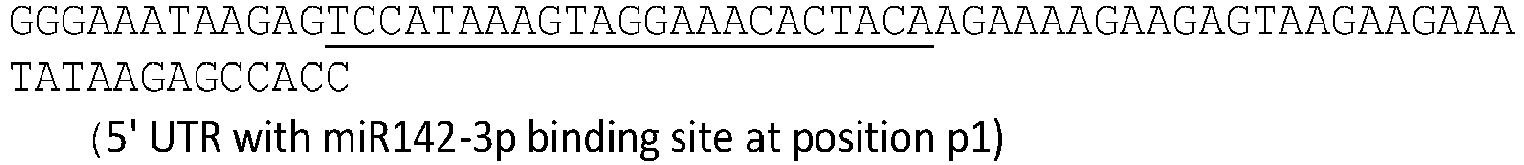 - the mRNA, i.e., mmRNA comprises 1-4, one, two, three or four miR binding sites for microRNAs expressed in immune cells. These miR binding sites can be for microRNAs selected from the group consisting of miR-142 (including miR-142-3p and miR-142-5p), miR-146 (including miR-146-3p and miR-146-5p), miR-155, miR-126 (including miR-126-3p and miR-126-5p), miR-16, miR-21, miR-223, miR-24, miR-27, and combinations thereof.