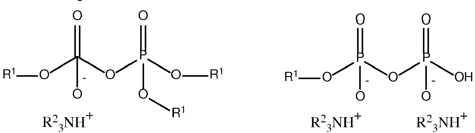 - this salt composition at least 30 mole percent of the phosphorus atoms are in an alkyl pyrophosphate structure, as opposed to an orthophosphate (or monomeric phosphate) structure.