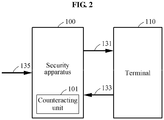 - FIG. 1 is a diagram illustrating a security apparatus 100 connected to an external terminal, for example, a terminal 110 and a server 120 to perform data processing according to an example embodiment.