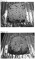 - Figure 1 a-e Cheese analogue block of the invention according to the standard recipe (a), in shredded form (b), applied on a test pizza (c), after baking the pizza until cheese analogue melting (d), and showing the stretch of the molten cheese analogue (e).