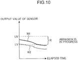 - An output value of the sensor 150 is an intensity of the signals that are output from the sensor 150 and indicates the magnitude of the supersonic waves generated by the rotary blades 21 during the rotation on the die surface 61.