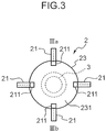 - the four rotary blades 21 are arranged at an interval of 90 degrees on the other end surface of the fixation unit 23 (bottom surface 231 of the circular cone frustum). Description will be given on an example in which the number of the rotary blades 21 is four; however, the number of the rotary blades 21 is not limited to four.