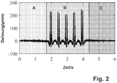 - the senor measures at least one elongation per unit time of the guideway component. This is recorded in particular by a strain gauge, which is arranged directly on the guideway component. Alternatively, the strain per unit of time can also be determined by an optical strain measurement method. From a measured temporal expansion signal, a speed and / or an acceleration of a rail vehicle rolling over the guideway component is subsequently determined, for example.