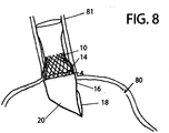 - Figure 8 illustrates a stent 10 inserted in an esophagus 81, where the esophagus meets the stomach 80, and the sock 20 extends into the stomach 80.