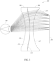 - Figure 3 shows a left-side sectional elevational view of an optical system 300 (e.g ., optical system 210 or optical system 212 of Figure 2 ) and a display 302 of the head mounted display system 200 of Figure 2 which includes a double Fresnel two element design.