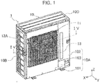 - the front panel 10A includes a first front panel section 101 that forms most of the front-side outer wall of the outdoor unit 1, a second front panel section 102 that forms an upper right portion of the front-side outer wall and a portion of the right-side outer wall, and a third front panel section 103 that forms an lower right portion of the front-side outer wall and a portion of the right-side outer wall.