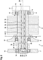 coolant conduction element 22 comprises an open circumferential, namely helical,contour 30 extending in axial direction of the shaft 9 and protruding into theouter section 26. Thecontour 30 is realized by acontour element 31 arranged around thecoolant conduction element 22. Thus, when the shaft 9 rotates, thecoolant conduction element 22 stands still and by means of thecontour 30 the reverse flow of the coolant is enhanced because of the contour having an effect similar to an axial pump. -