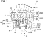 - the side wall of the drive bush 22 according to the present embodiment has the protruding portion 22a which supports the angular bearing 24. If an outer ring diameter of the angular bearing is set to D o and an inner ring diameter is set to D i , it is preferable that the protruding portion 22a protrudes 1 mm or longer from the side wall of the drive bush 22 and protrudes within a range equal to or shorter than a numerical value calculated by ⁇ (D o -D i )/2 ⁇ 3.