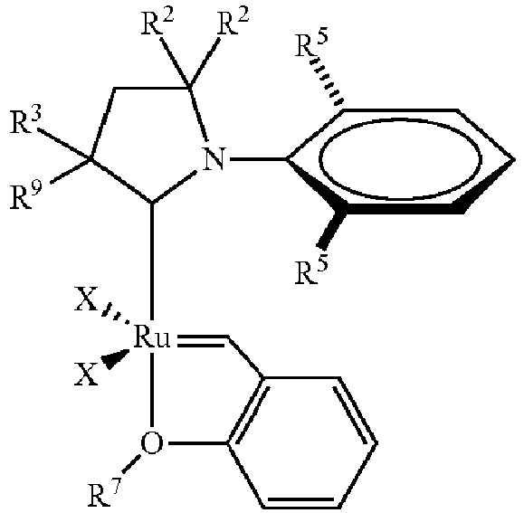 - US 6 921 735 discloses ruthenium complexes bearing a 1,3-dimesityl-4,5-dihydroimidazol-2-ylidene and styrenyl ether ligand.