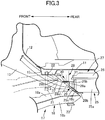 - Rear parts of the left and right longitudinal frames 18 of the front subframe 17 are fastened by screwing two bolts 21, extending through the rear parts from bottom to top, into two nuts 22 provided in the interior of the front cross member 15 and, furthermore, one ends of a pair of left and right stays 23 are fastened together by the bolts 21 and other ends of the stays 23 are fastened to the rear ends of the left and right front side frames 13 by two bolts 24.