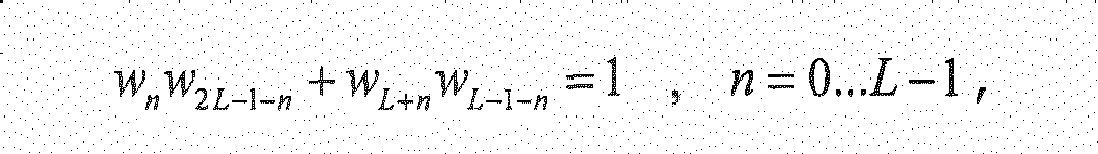 - the right side overlap of the asymmetric long analysis window has been shortened, which means all of the rightmost window samples have a value of zero. From the equation above it can be seen that if a window sample w n has a value of zero, an arbitrary value can be chosen for the symmetric sample w 2 L -1- n . If the rightmost m samples of the window are zero, the leftmost m samples may therefore be replaced by zeroes as well without losing perfect reconstruction, i.e. the left overlapping part can be truncated down to the length of the right overlapping part.