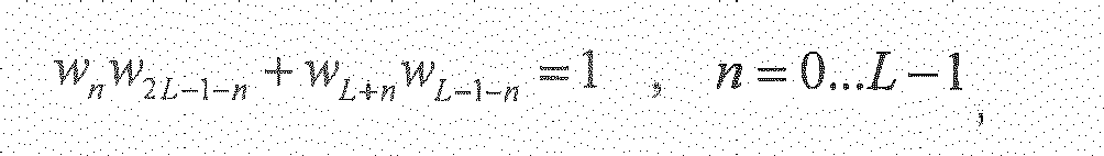 - the right side overlap of the asymmetric long analysis window has been shortened, which means all of the rightmost window samples have a value of zero. From the equation above it can be seen that if a window sample w n has a value of zero, an arbitrary value can be chosen for the symmetric sample w 2 L -1- n . If the rightmost m samples of the window are zero, the leftmost m samples may therefore be replaced by zeroes as well without losing perfect reconstruction, i.e. the left overlapping part can be truncated down to the length of the right overlapping part.