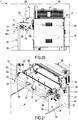 - the operator removes the side bars 43, 44 from the respective shaped plates 19, 22 (keeping them in any case constrained to the respective pneumatic pistons) and possibly also the spacer reinforcing element 50 (see figure 19 ) and, following the direction given by the arrow K in figure 20 , extracts from the inlet (or from the front part 52 of the machine 1) the lower cylinder 3 and the carriage system 51 which supports it, causing it to slide outwardly along firstly the main tracks 40, 41 of the first guide means 32 and subsequently along the auxiliary tracks 38, 39 belonging to the second guide means 33 and previously installed with the auxiliary structure 34.