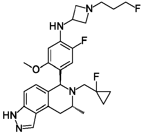 - UVWQXYPVIVMIJO-ZEQRLZLVSA-N CN(C1CN(CCCF)C1)c1ccc([C@H](c2ccc3[nH]ncc3c2C2)N(CC(F)F)[C@@H]2N)nc1 Chemical compound CN(C1CN(CCCF)C1)c1ccc([C@H](c2ccc3[nH]ncc3c2C2)N(CC(F)F)[C@@H]2N)nc1 UVWQXYPVIVMIJO-ZEQRLZLVSA-N 0.000 description 1